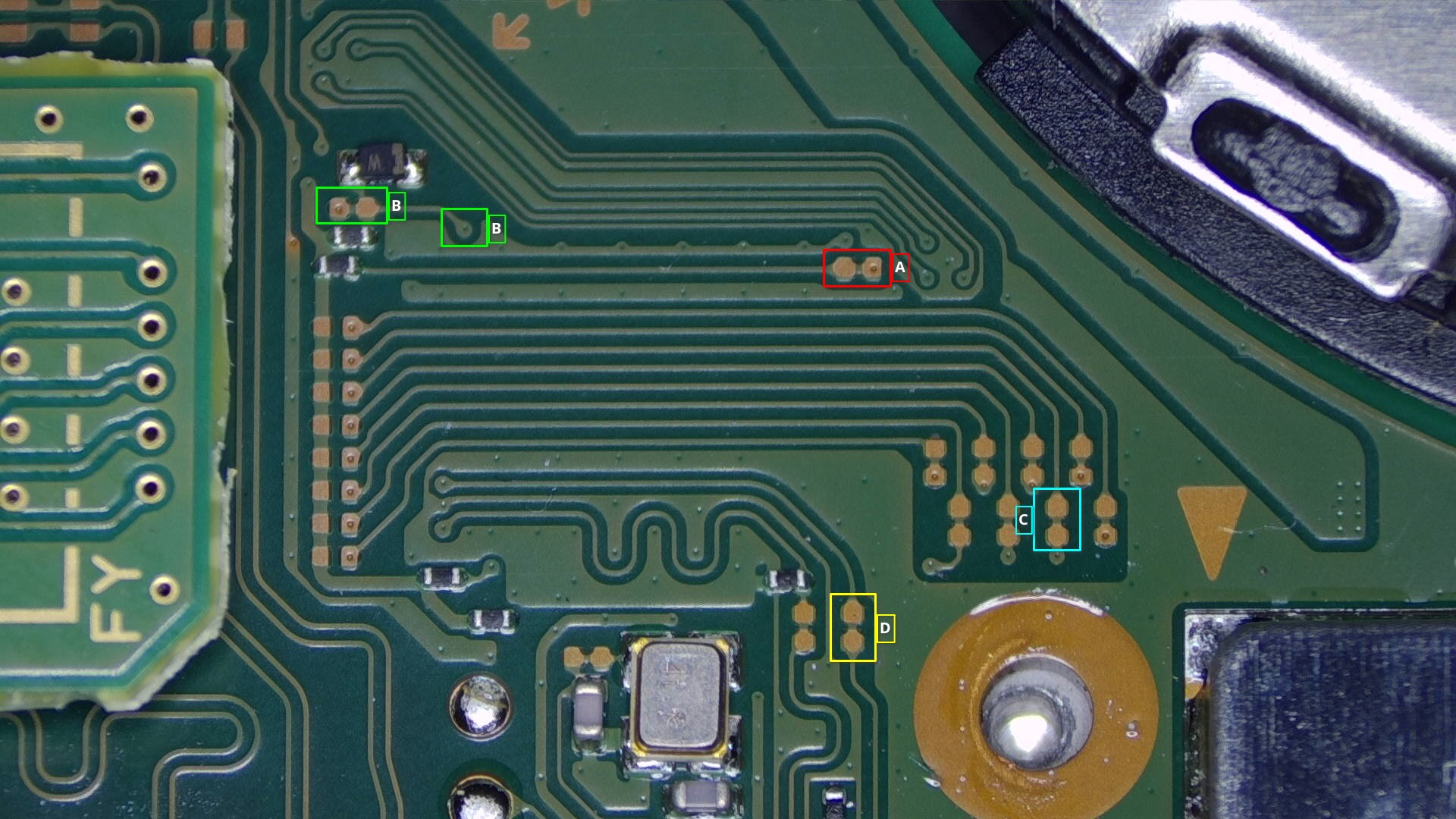 Move on to the area above the SoC. In the image below, the required pads are outlined and named.