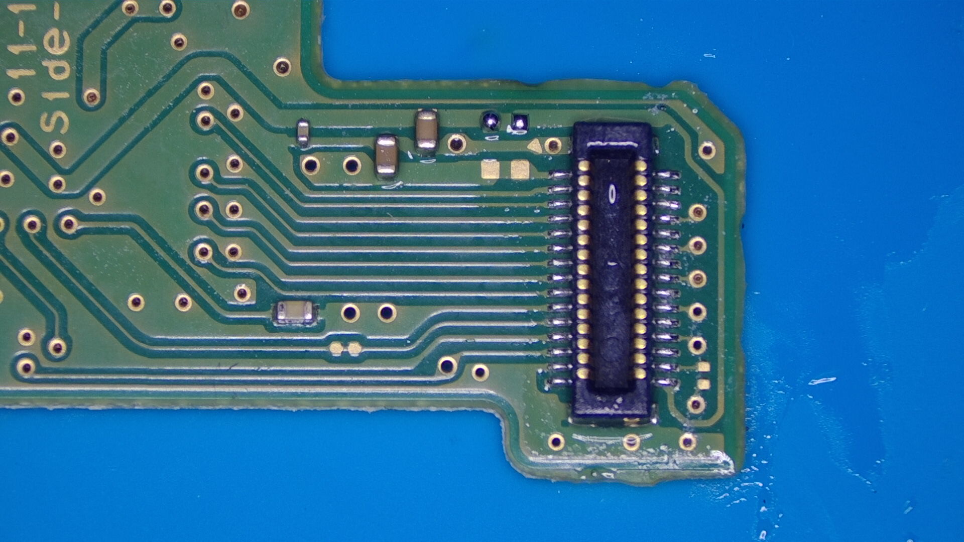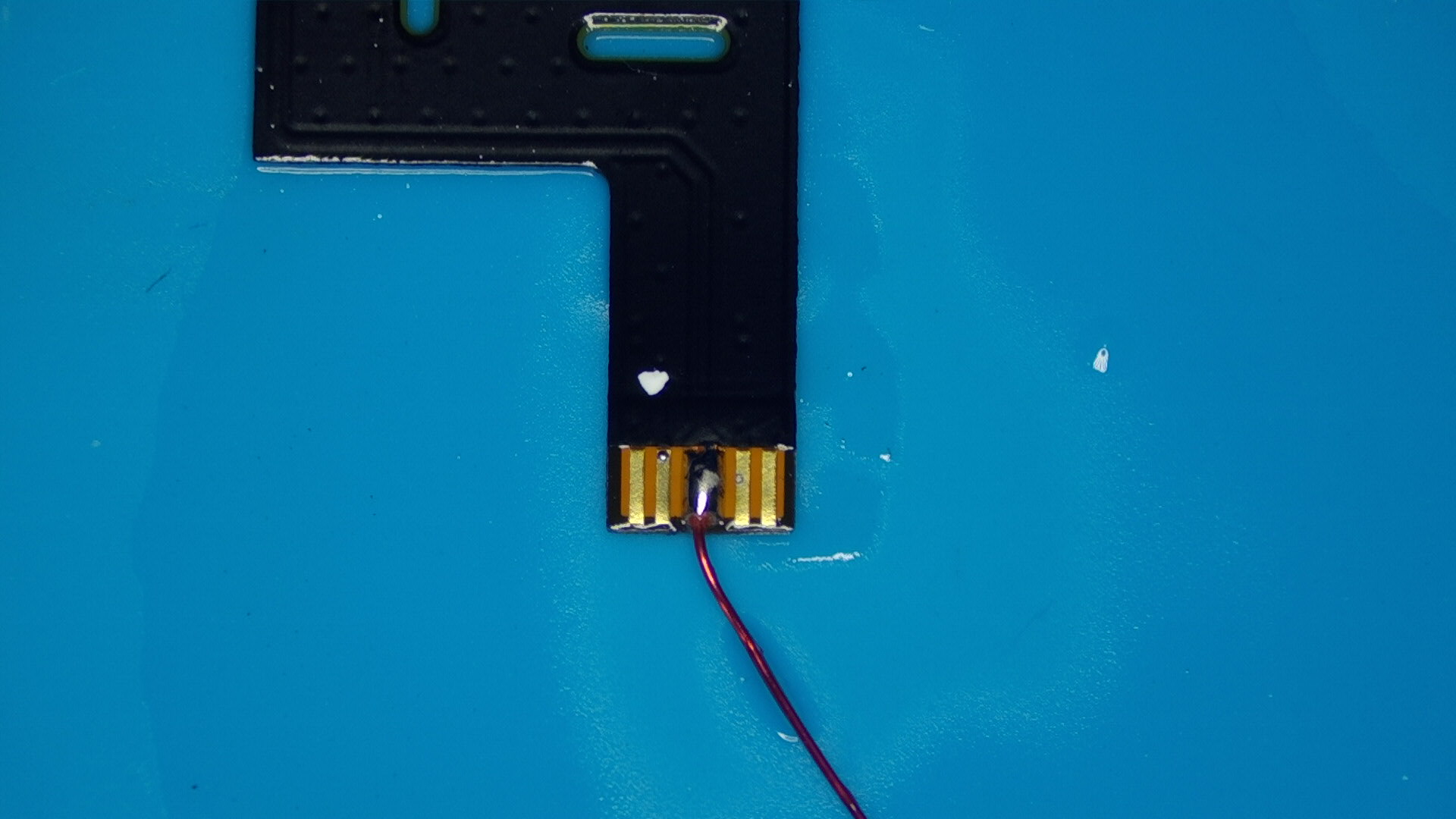 Solder the wires onto each point now. Make sure there's a solid connection between the pads on the board and your wire. I've scraped the solder mask off of the via at the